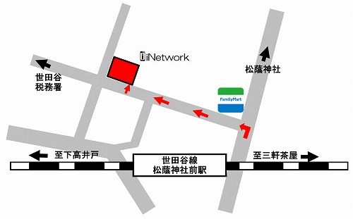 世田谷線「松陰神社前駅」で下ります。改札はありませんので三軒茶屋方面出口へ向かいます。そこから左手にファミリーマートが見えます。